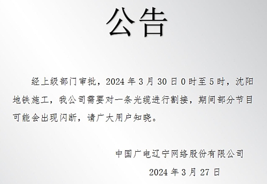 經(jing)上級部門(men)審(shen)批,2024年3月30日(ri)0時至5時,沈陽地(di)鐵施工,我公(gong)司需要對(dui)一(yi)條光纜進(jin)行割接,期間部分(fen)節目可能會出現閃斷,請廣大(da)用(yong)戶(hu)知曉。