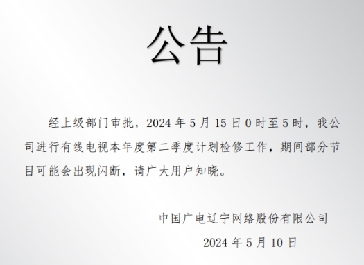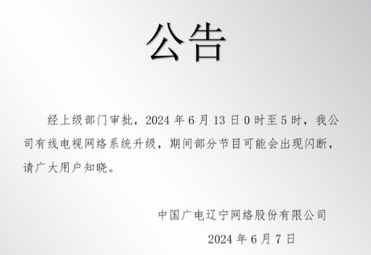 經上級部門審(shen)批,2024年6月13日0時至5時,我(wo)公司有線電視網絡(luo)系統升級,期間部分節目可能會出現閃斷,請廣大(da)用(yong)戶知曉(xiao)。