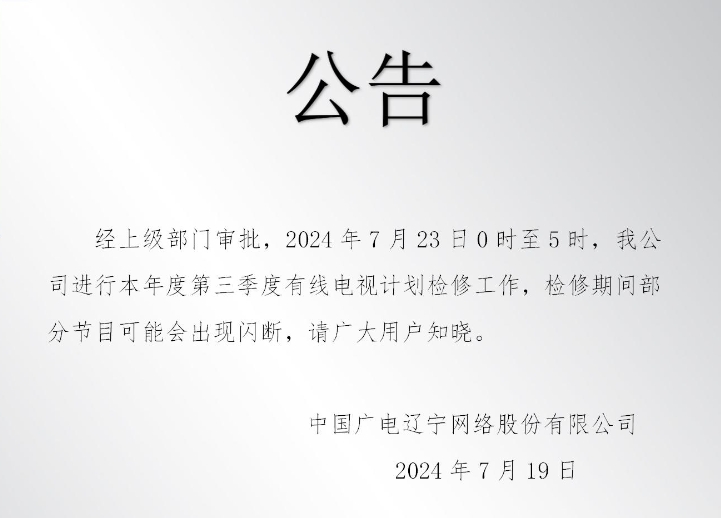 經上級(ji)部(bu)門審批(pi),2024年7月23日0時至5時,我公司進行本(ben)年度第(di)三季(ji)度有線電視計劃檢修(xiu)工作,檢修期(qi)間部分(fen)節目可能會出現閃斷,請廣大用戶知(zhi)曉(xiao)。