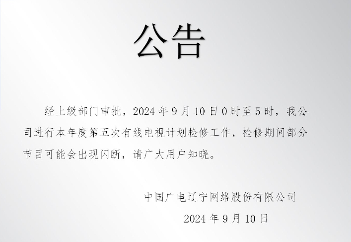 經上(shang)級部門審批,2024年9月10日0時至5時(shi),我公司進行本年(nian)度(du)第五次(ci)有線電(dian)視計劃(hua)檢修工(gong)作,檢(jian)修期間部分節目(mu)可能會出現閃斷,請廣大用戶知曉。
