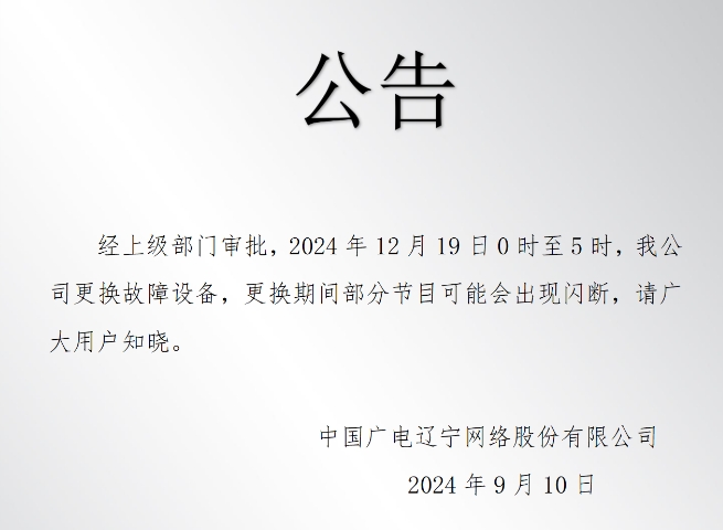 經上(shang)級(ji)部門審批,2024年12月19日(ri)0時(shi)至5時,我公(gong)司更換故障設備,更(geng)換期間部分節目可能會出現閃斷(duan),請廣大用戶知曉。