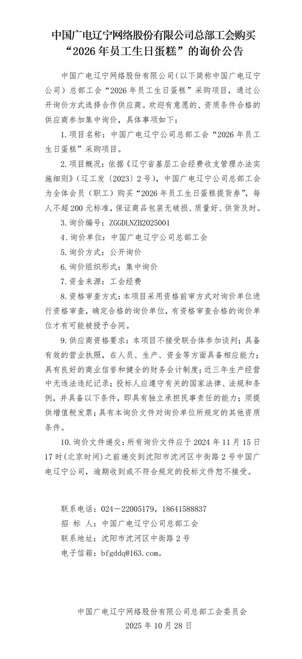 中國廣電遼寧網絡股份有限公司總部工會購買“2025年員工生日蛋糕”的詢價公告